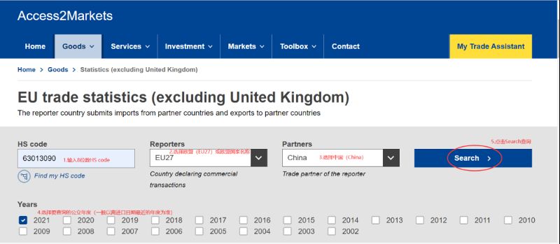 查询网址:https://trade.ec.europa.eu/access-to-markets/en/statistics