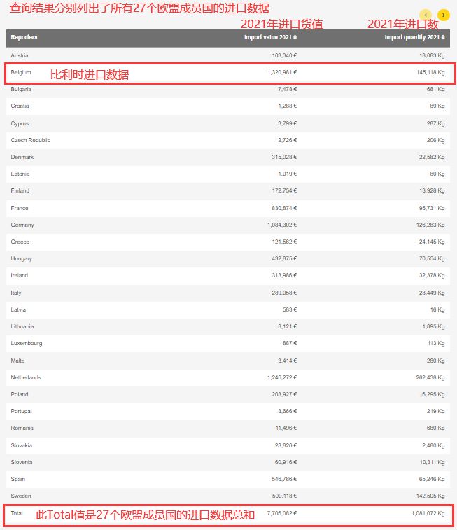 ▶ 查询出来的数据如下,分别列出了所有欧盟27个成员国在2021年度的进口数据,其中Totel值代表27个欧盟成员国的进口货值和数量总和: